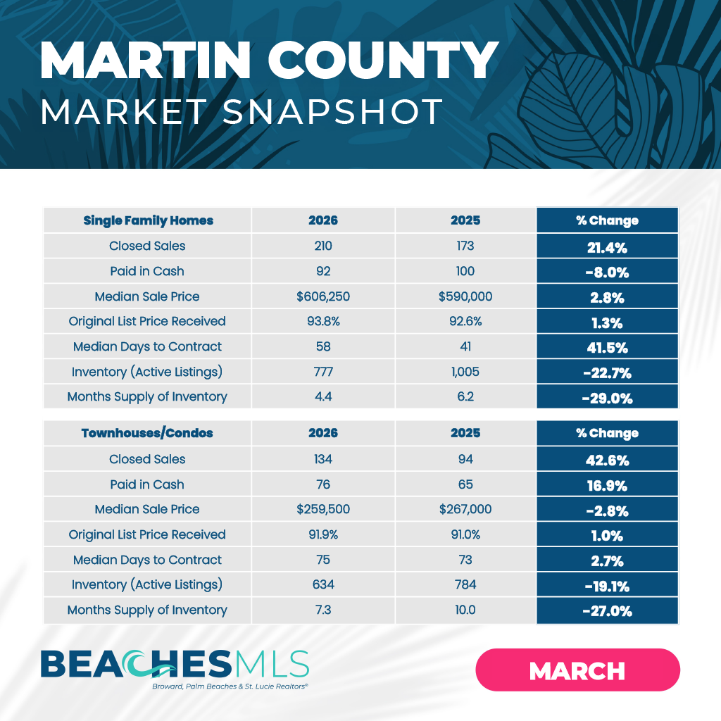 “Martin County’s market picked up meaningfully in March, with more buyers entering the market and pending sales showing continued momentum,” said Jonathan Dolphus, President of Broward, Palm Beaches & St. Lucie Realtors®. “While homes are still taking longer to sell than they did a year ago, the rise in closed sales and tighter inventory show that well-priced properties are continuing to attract attention. A local Realtor® can help buyers and sellers navigate these shifting conditions with confidence.”
